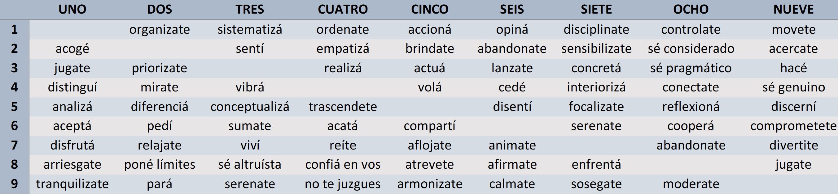 En la tabla de la siguiente página, se detalla qué compartimos y qué recibimos, a fin de cumplimentar nuestra misión de vida. En cada uno de los casilleros hay una palabra significativa, que nos sugiere HACER para SER. Ser nosotros mismos, a lo largo del camino...